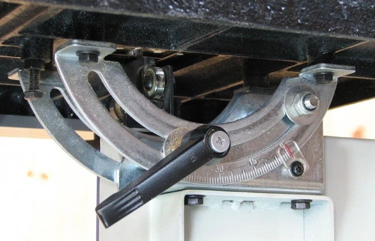 It Also has a cast iron table that tilts from 90 degrees to 45 degrees and has a positive stop at both of those positions. Therefore any angle in between can be read off the scale and locked in. For rip cuts the guide fence can be situated on either side of the blade. It can also be locked into position with a single press of the lever and has a clear marker to set against the metric scale. The fence itself can also be fitted in two ways. When cutting thicker material the full face height of 60mm is used. When cutting thin and narrow strips the fence is fitted with the small face, against the blade therefore allowing clearance around the guides.
