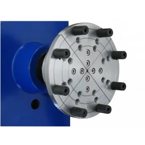 The jaws are 120mm diameter when closed, 144mm diameter when opened. the work piece is held in place by 8 rubber coated fixings which can be fitted in 3 different positions on the jaws depending on the diameter required.