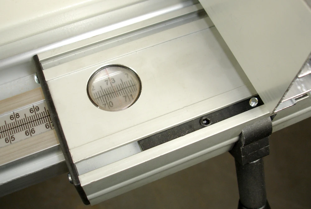 The main table is precision ground cast iron and also has 2 fabricated side extension tables to give impressive cutting capacities. The induction motor turns the blade via a drive belt which reduces noise and increases accuracy. Blade height and blade angle are controlled using 2 separate hand wheels. The sliding carriage, included as standard, is a joy to use with a cast iron bed travelling on 4 bearing guides. Any angle can be set on the long support fence. A screw clamp holds the work secure and a flip over length stop is fitted for repeat cuts.