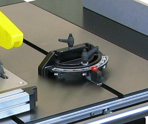 The sliding mitre fence is also adjustable to 60 degrees in each direction. It is provided with preset stops to locate it accurately at 45 degrees and 90 degrees. Therefore a sacrificial fence can be easily mounted using the fixing holes provided.