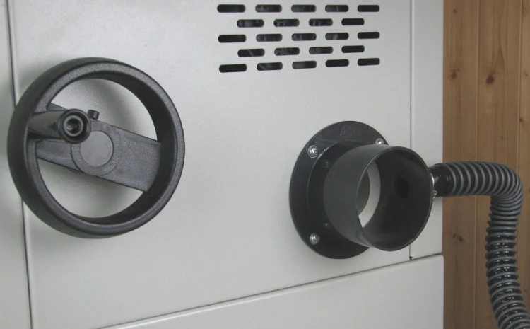 Efficient dust extraction is also included as standard. Dust is collected from the back of the saw guard and a hose transfers it to the rear of the machine. Underneath the table is a hood which collects more dust and also transfers it to the same collection point. A single extractor hose connection point of 100mm diameter is provided at the rear of the machine. Therefore allowing it to be connected to your dust extraction system.