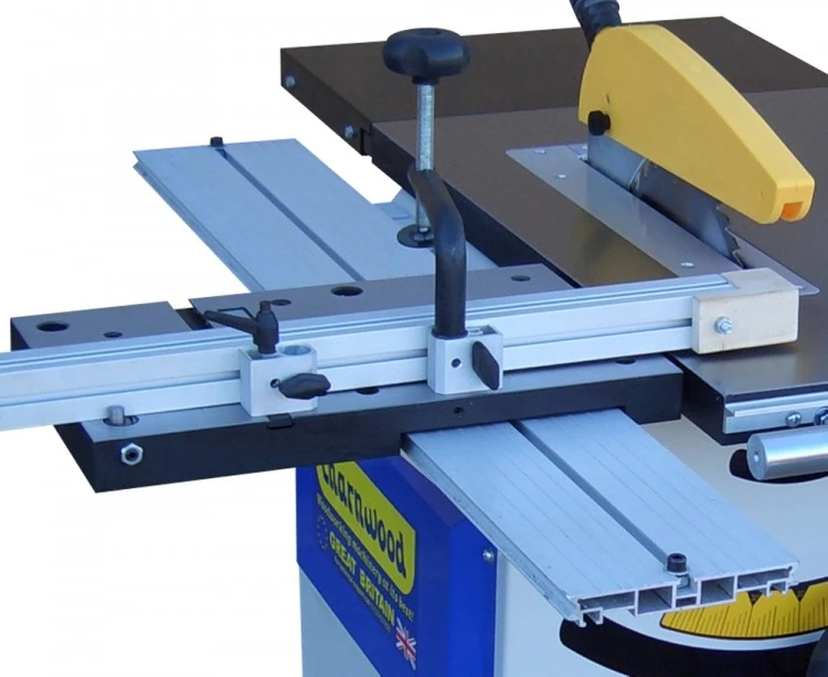 On the left hand side of the saw is the sliding crosscut carriage. The table is also made from cast iron and precision ground thus allowing for a durable flat surface. The table also runs on four sealed for life bearings along an aluminium guide track. The fence itself can be locked at any angle from 90 to 45 degrees and a positive stop allows the fence returns back to the 90 degree position. A work clamp also ensures timber stays locked in position during the cut. A flip-over length stop to allow for accurate repeat cutting completes the carriage assembly.
