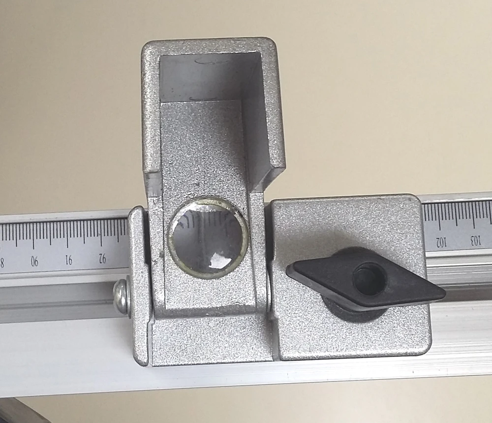 For crosscutting solid wood there is also an auxiliary mitre fence. This is also adjustable 60 degrees each way and has a cam lock vertical work clamp.