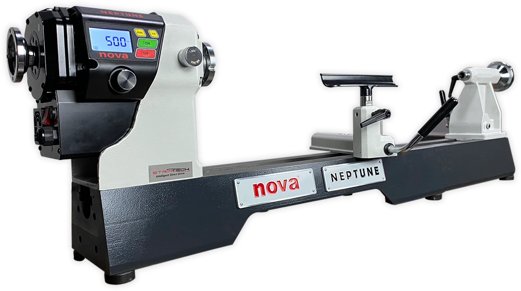 Experience all the features of a full-size DVR machine on benchtop lathe with NOVA Neptune Midi, the new 1.5HP lathe with an intelligent direct-drive digital motor from Straitech that’s redefining what a midi lathe can do. Neptune goes far beyond any other lathe in its class: just a twist of a knob and speed can be adjusted from 100 rpm up to 4000 rpm with no sacrifice in torque. Neptunes outstanding machine features and specifications include a 360-degree pivoting and sliding head, a 15” (381mm) over bed swing with 18” (457mm) between centers. Whether you’re turning large projects or small, Neptune’s unparalleled, smart motor technology from Striatech has an easy-to-use, software-driven controller and provides the ultimate in smooth performance, intelligent control, and power under load.