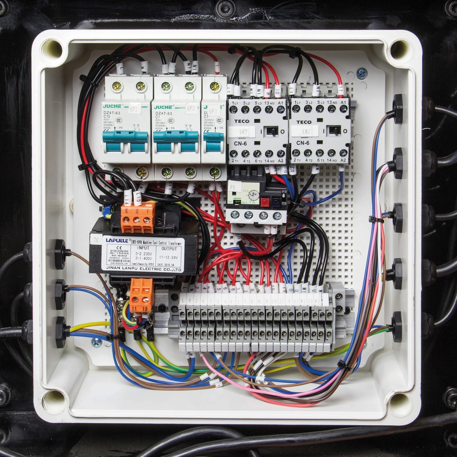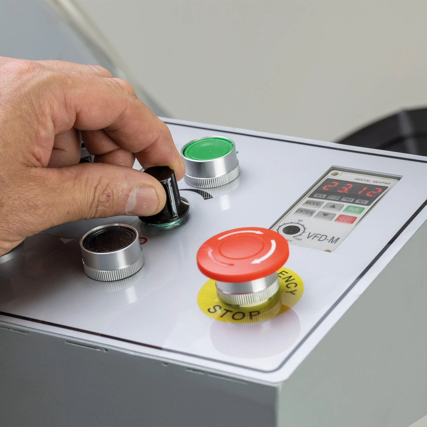 A low voltage (24v) control circuit minimises electric shock which limits harm to machine operators. Interlocking switches prevent saw running when blade guard is opened. Adjustable blade covers limit exposure during cutting for greater user safety.