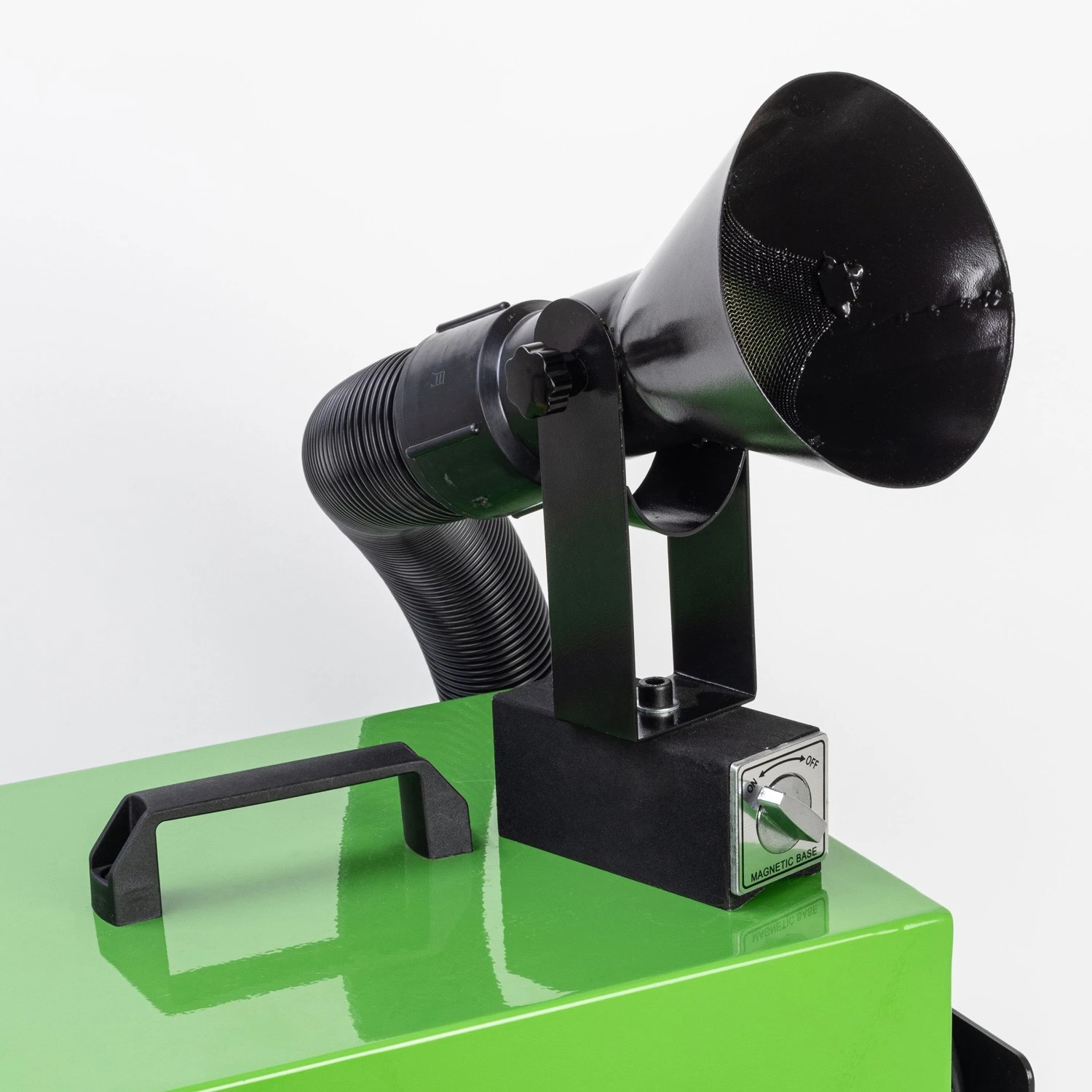 - Large switchable magnetic and tilt-adjust suction hood captures fumes