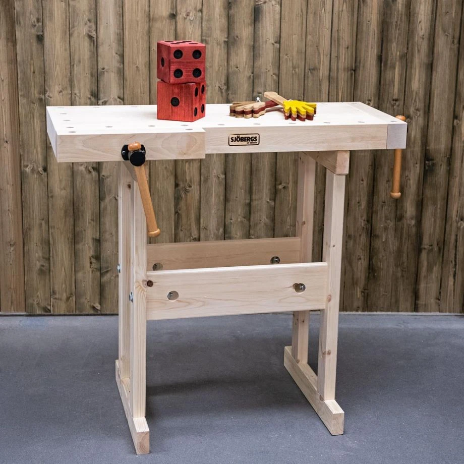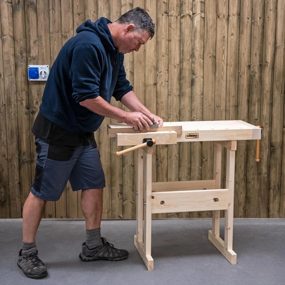 Sjöbergs Dual Height Compact Bench, designed to serve as an innovative workspace suitable for both adults and children. The adjustable trestle offers two distinct working heights, accommodating various tasks and promoting ergonomic postures for adults, whether standing or sitting. Crafted from robust solid birch and featuring two convenient rows of dog holes, this bench is an ideal addition to any family workshop or educational setting, ensuring comfort and flexibility for all users.