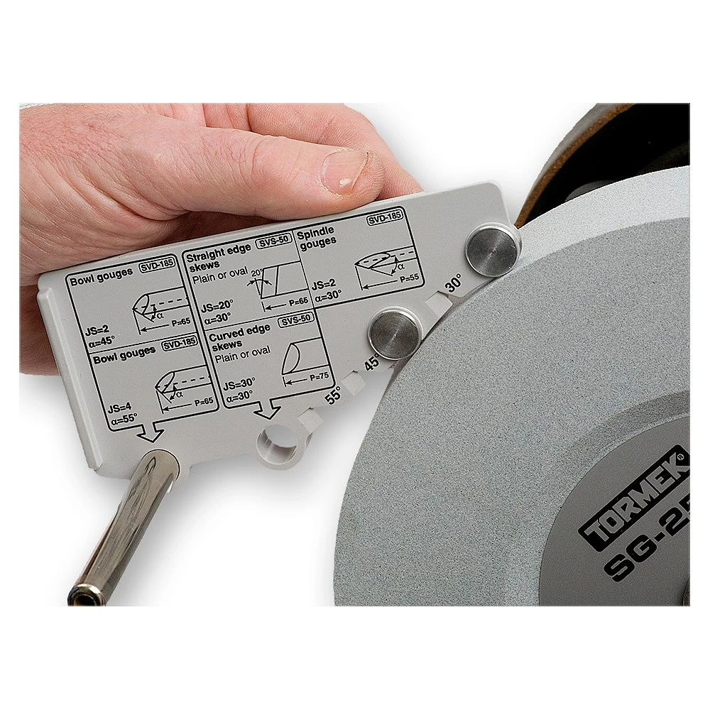 The Setter works with the TORMEK jigs SVD-185 for gouges and the SVS-50 for skews. The built in settings give you pre-determined edge geometries, which are recommended by experienced turners around the world. You do not need to worry about whether you have the right shape.
